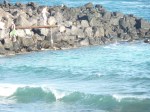 There were multiple tidepools along the edges. In the middle, a wall of lava rock broke the heavy waves coming in, making the beach quite calm. To the right, a hill led to another lagoon. To the left, above where we were, another path led to what appeared to be a popular Teen Hangout. Kids dove or jumped off this piece of wood into the water. It looked deep– in one pic, there’s a boy climbing out using a rock, which makes it look shallow.