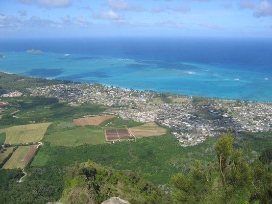 Mariner’s Ridge is an expensive part of Hawaii Kai, where we live. It’s populated with big two-story homes that are probably made out of the same old garage door material as everywhere else, only with ocean views. We hadn’t been up there before. One thing that makes me nervous about most places around here is that these neighborhoods all have one road in– the same road that goes out. No wonder the traffic’s so bad in the morning. Anyway, Cadillac and I relished the chance to finally check out Mariner’s Ridge. We’d also heard there is a trail up there that winds through a pine forest with an ocean view. But at night, you can see the whole city.