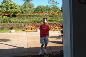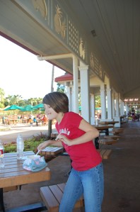 So of course there were, ahem, a few wrong turns. But we found the next station. And then one more. And the people were starting to get hot and burned and wanted their pineapple ice cream. Cadillac, however, wanted to finish the maze, all 6 or so hidden stations. Kaiya agreed with me and I pointed out that Cadillac’s un-sunblocked neck was turning red, so he agreed to stop his mission. One thing about my husband: once he starts something he wants to finish at all costs, no matter if the rest of his family is face-down in the pineapple top someplace, crying out hoarsely for ice cream. We’re kind of wimpy like that. The kids get it from me.