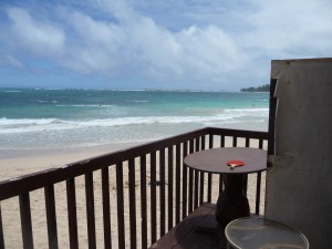 The beach hut was a 10X10 construction made to look like a real Hawaiian hut, which is to say it was made out of plastic straw paper on the roof and was made out of what looked like MDF or plywood painted to look like bamboo. Inside, the roof was pitched and covered in actual straw matting. Also, there was a porch, built on a sandy hill that looked like it was 18 inches from evaporating.