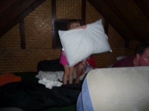 Inside there was a small sleeping area platform and a floor space where Cadillac would spend a horrible hour and a half pumping up the air mattress with a small footpump, only to be foiled by a faulty valve before starting over. Luckily, the kids were outside to spare them the blue streak.
