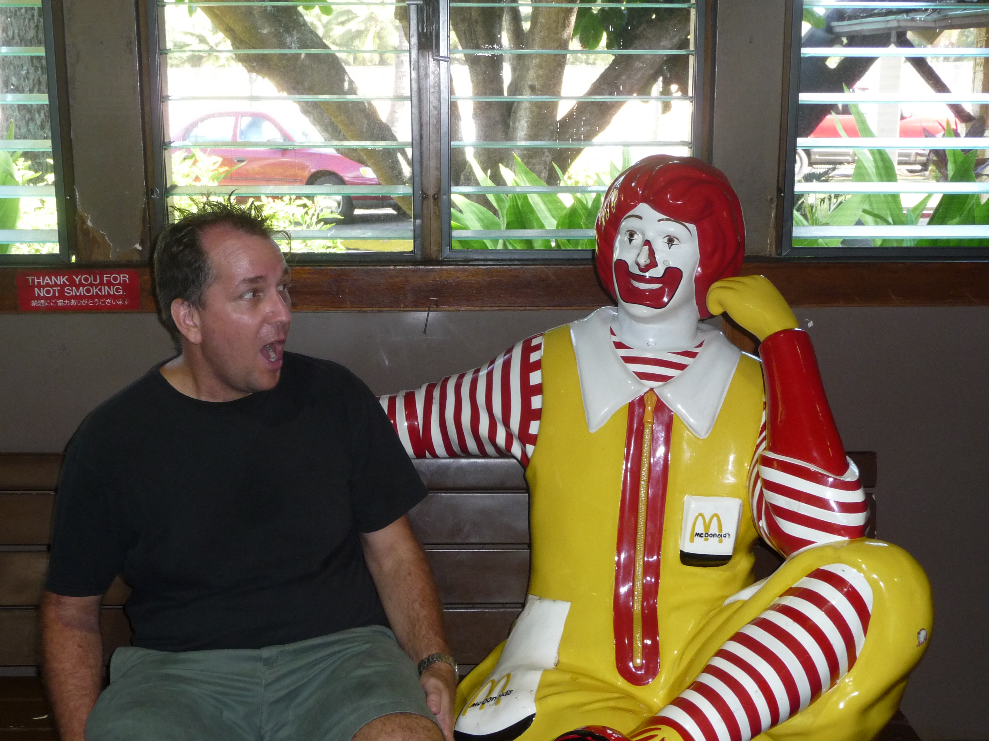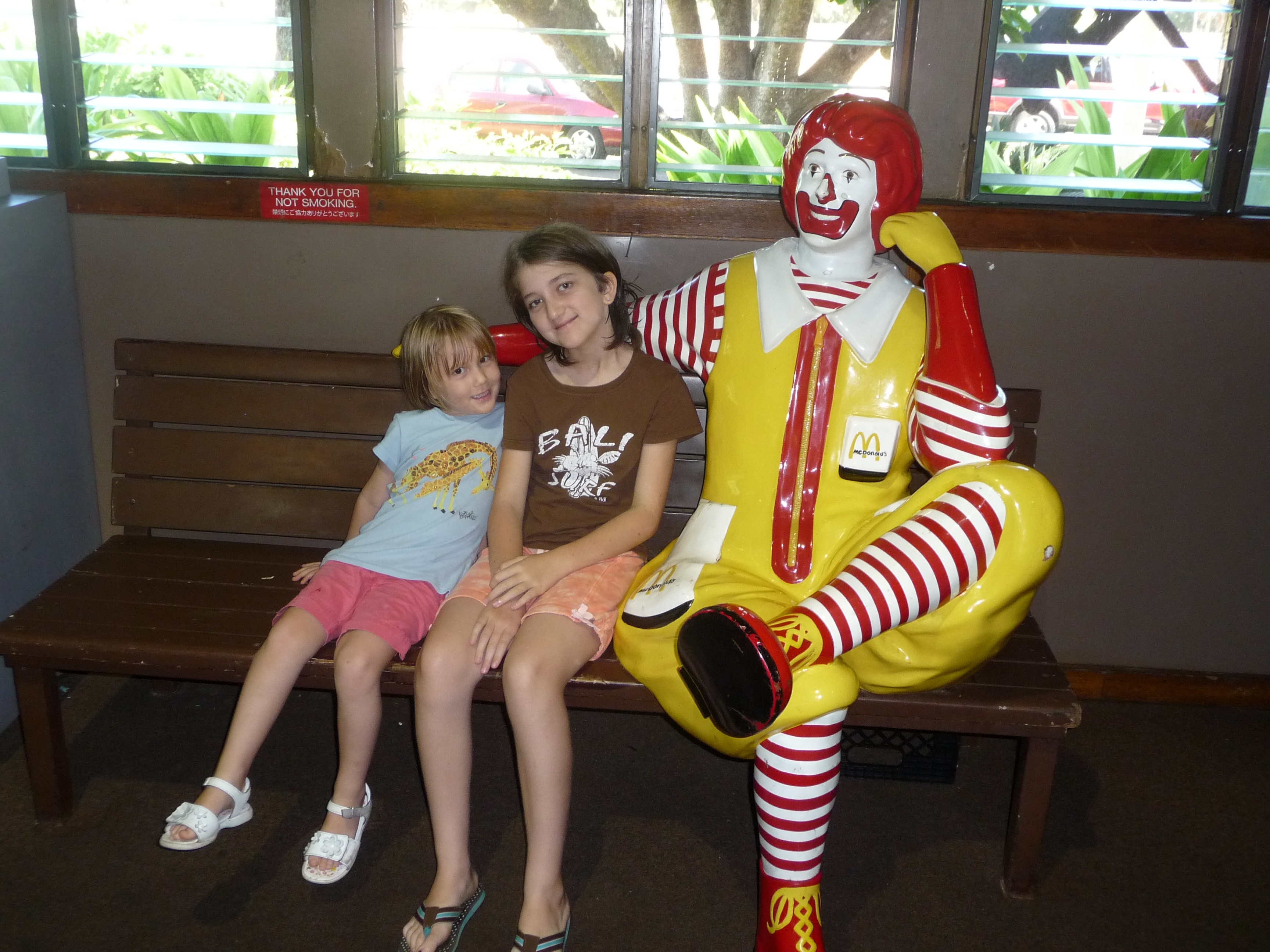 By 8, we were packed and out of there. We stopped at McDonald’s in Laie, which incidentally is huge and looks like it used to be a Swiss Chalet lodge or something. It has a huge rock waterfall and they charge you 50 cents for a glass of water, even if you just spend $25 on breakfast and the McMuffin is only $1 anyway.