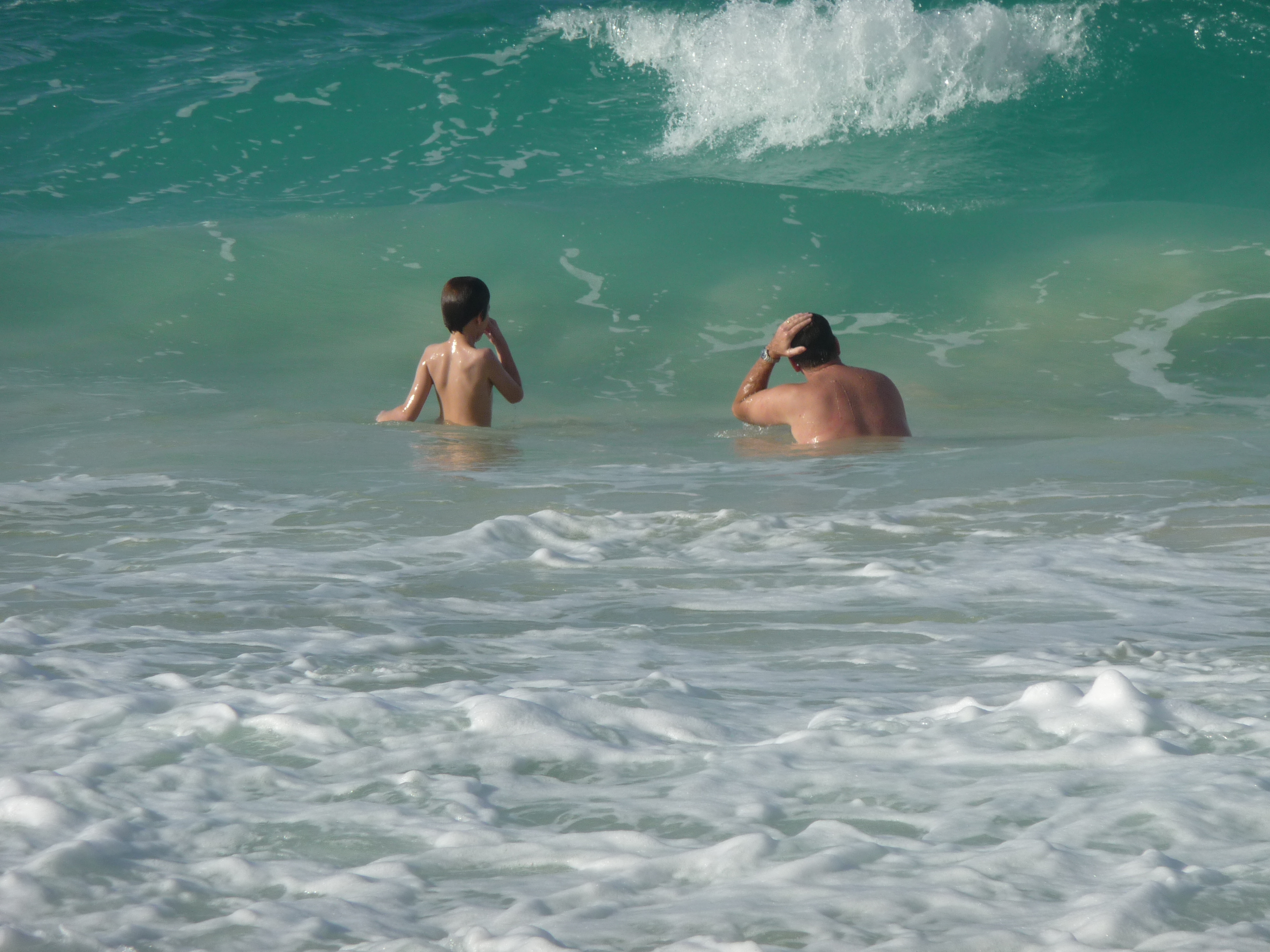 Ethan and dad are in the water at Waimanalo, ducking under waves, boogie boarding or body surfing, and I stand in the shallow part, gauging the waves and their roughness, watching the regularity.