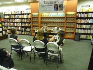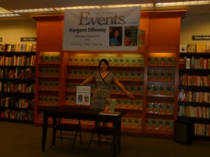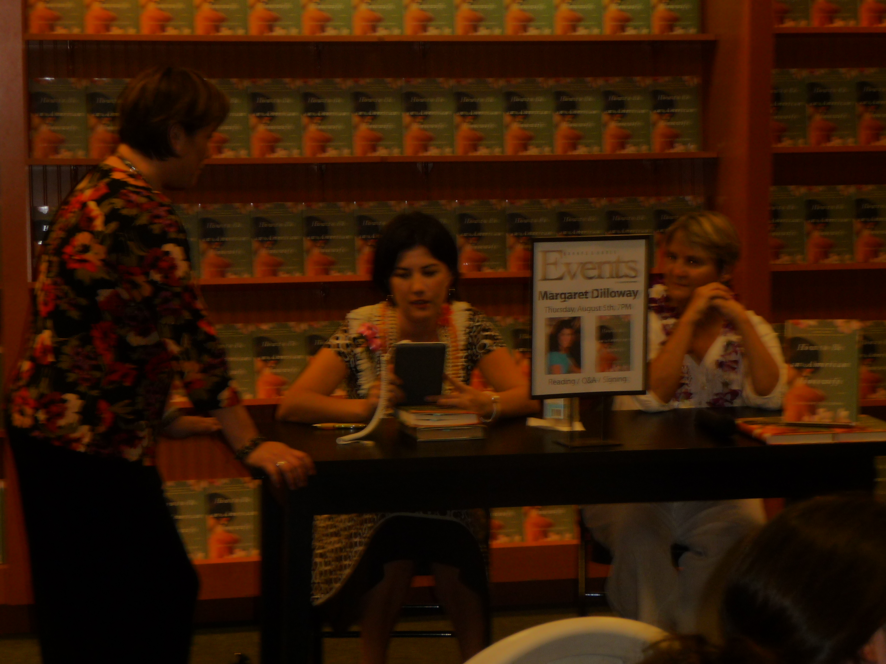 Last night I had the book launch at Ala Moana Barnes & Noble. It was back in the cookbook nook. They’d taken out all the cookbooks and put out a ginormous display of my books. Don’t the colors look awesome on that wood? I mean, if you can see the colors. The flash on the little camera isn’t big enough.