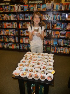 We put out some treats. Elyse got a free hot chocolate from the super-nice CRM at Barnes & Noble. She spent most of her time running around with her friend from school.