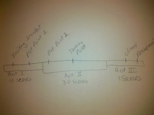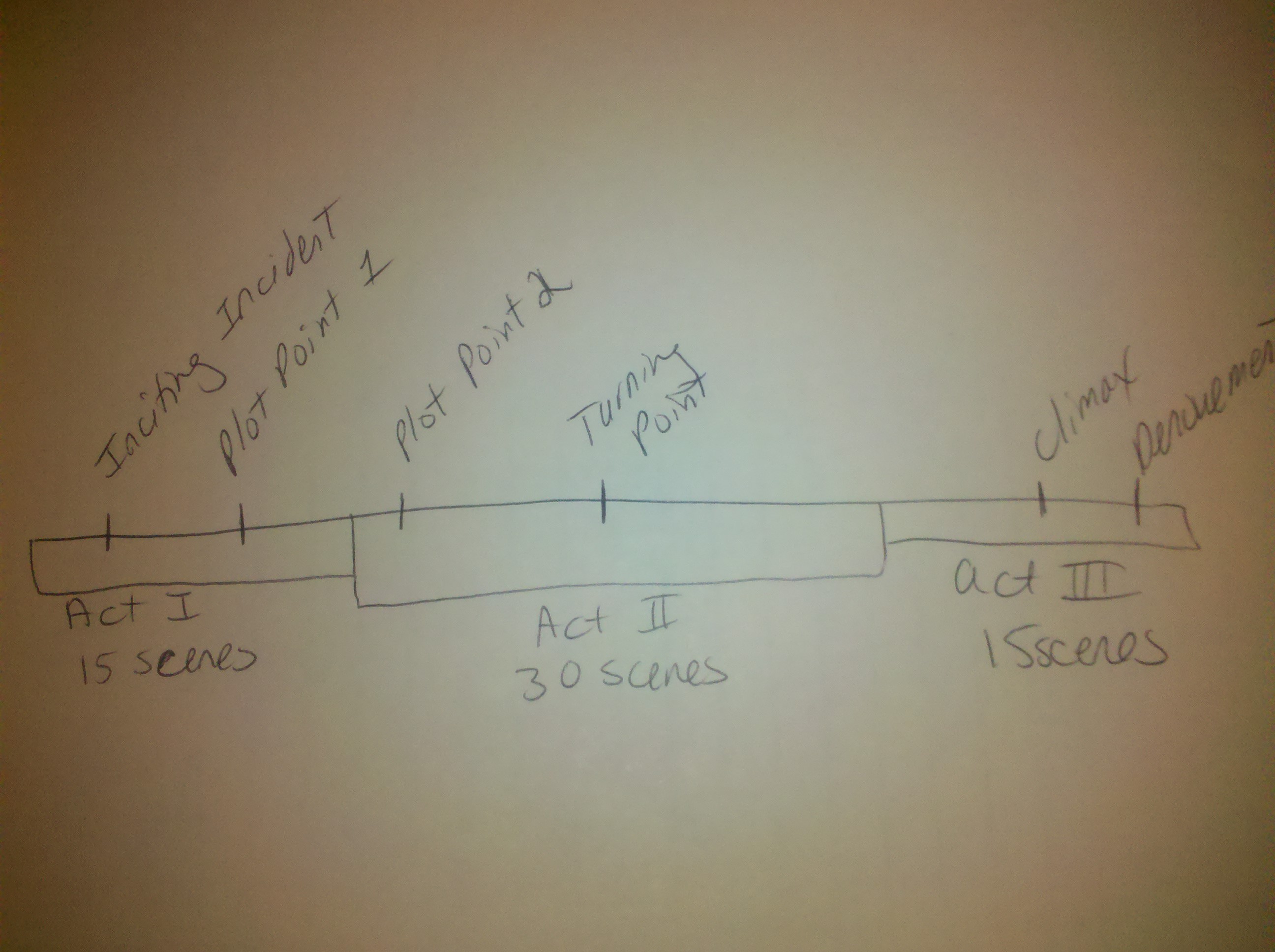 Most novels have about 60 scenes and three acts (like a screenplay). So, feel free to use this method to outline a screenplay as wellThe acts are a “series of sequences that culminate in a major turning point in a character’s life.” I wrote that down because Bernhardt said it twice.
