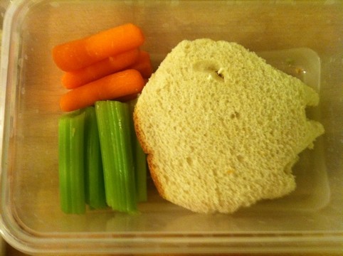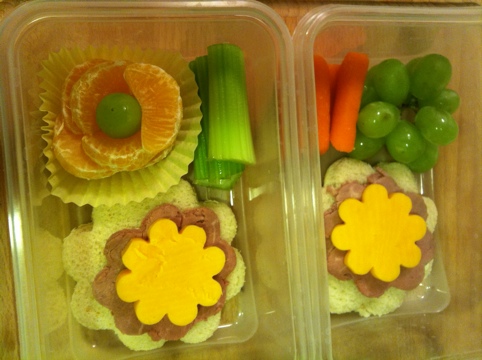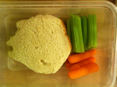 I came up with these. They also get a Chocodile (which are basically Twinkies dipped in chocolate), a bag of chips, and a drink, so they shouldn’t get hungry. My son, who doesn’t care for fruit much, gets twice as many veggies because that’s the rule when you don’t eat fruit– eat more veggies.