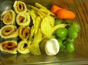 Also, in my quest for cute lunches, I made peanut butter and jelly “sushi” rolls. They’re easy to make, you just flatten the bread, spread the stuff, and roll it and cut them. Chopsticks optional.