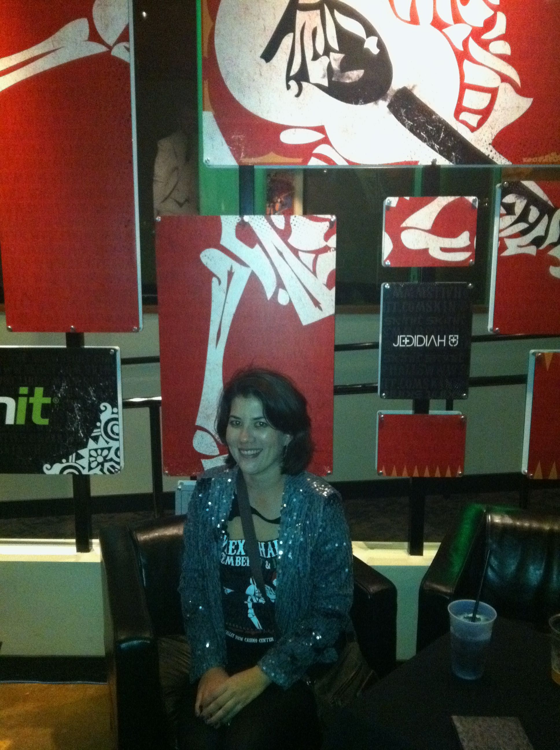 We found a lounge that said MEMBERS ONLY but nobody stopped us. I think people just didn’t know they could go in. The drinks were no more expensive inside than in the rest of the place. Beforehand, I bought a special Wrex the Halls shirt that promised free swag if you wore it! Free VIP things! but really all I got was to go ahead in line. The 91X girl (when I asked much later) said they gave out all their VIP passes. A thousand drats! I even (I don’t know if you can see it in the picture) cut it up really cute, because it was a non-curvy boy’s shirt. So punk of me, I know. I think it should have gotten me Special Honors or at least a ribbon.