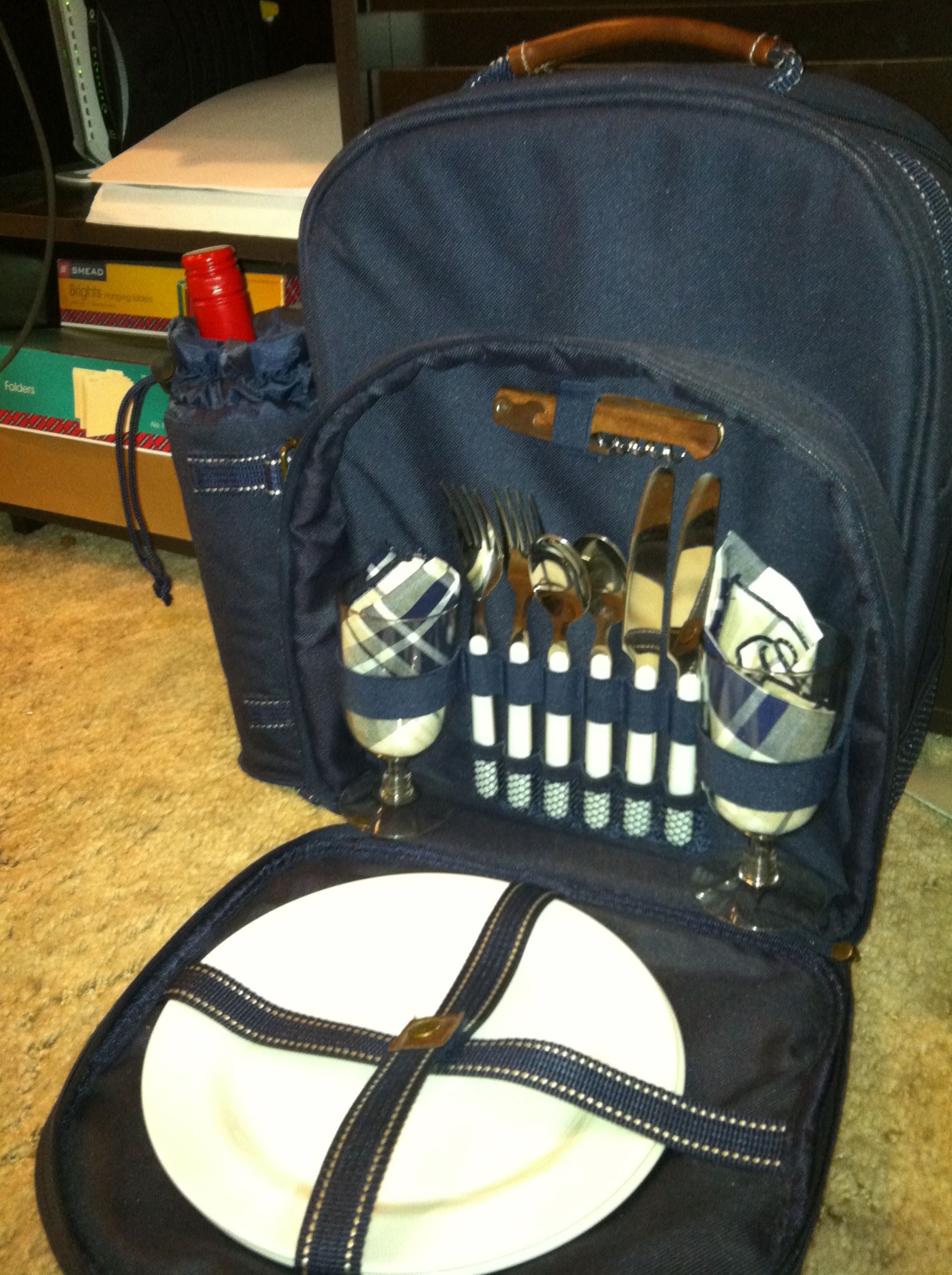 You can steal something three times, and I was the 17th up. By then the picnic backpack had been stolen twice. Friend Nancy came up with some Machiavellian plot she tried to get people involved with (you get me the backpack, and I’ll steal you the martini glasses) but I wanted the backpack for my own. I’d just seen one like it in a catalog.