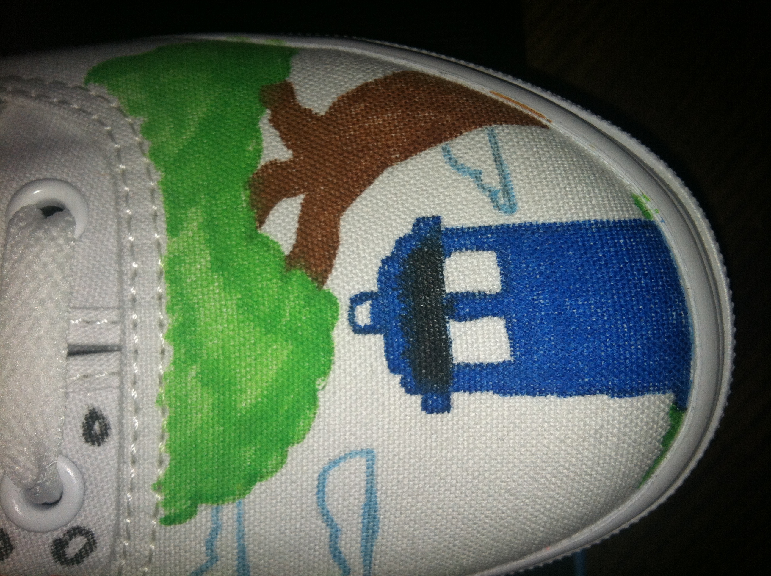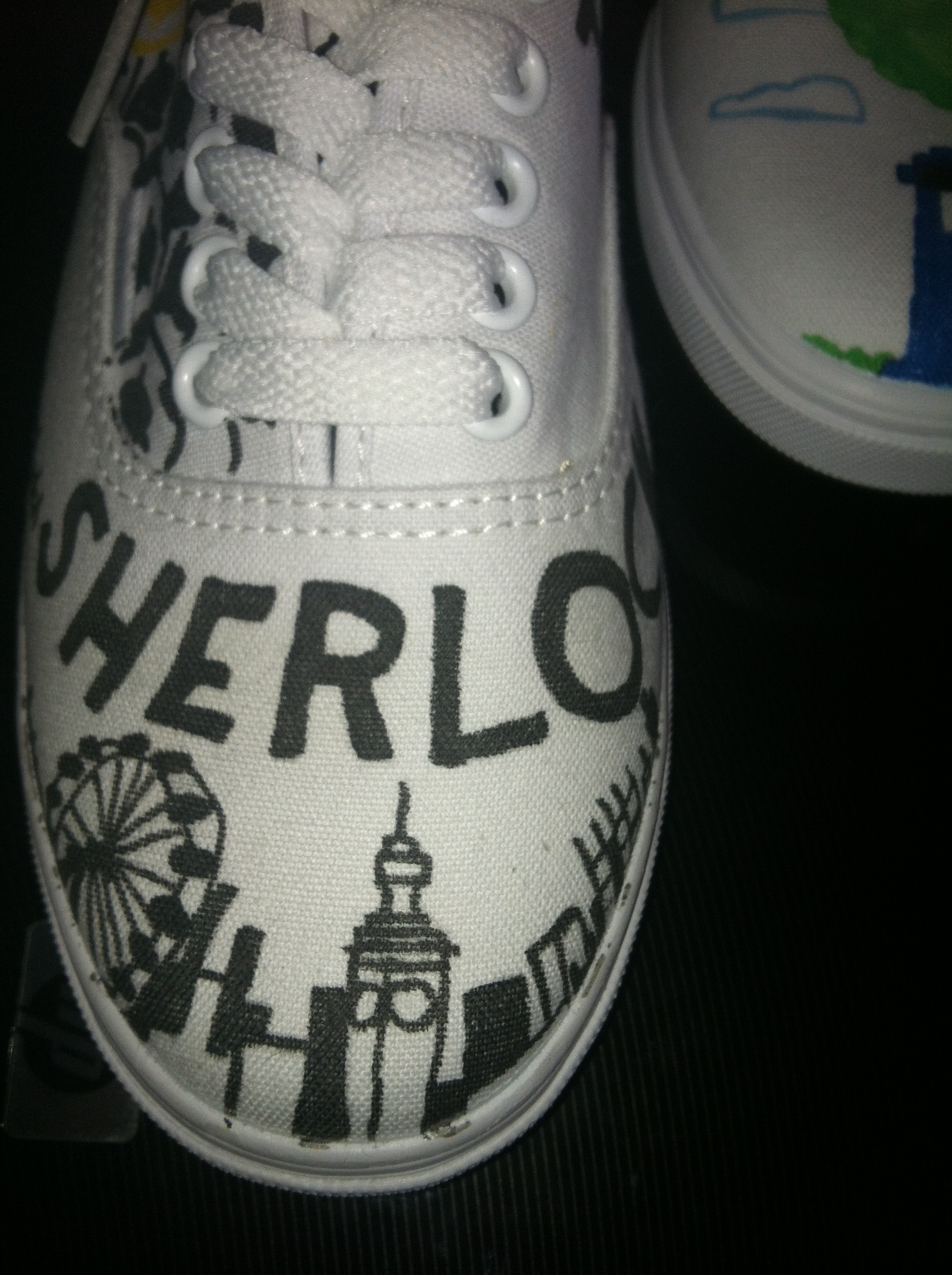 We got some white Vans for our 12-year-old over the weekend, and she turned them into a work of art with fabric pens. She’s a huge fan of the new BBC SHERLOCK series and the DR. WHO series, so she simply had to devote one shoe to each. I swear, I think the best thing about having kids is sort of observing them like I’m Jane Goodall in the wild. My kid doesn’t like stuff like the usual boy bands (i.e. One Direction or whatever). Instead, she’s into anything the BBC produces. Also, she recently became a fan of the 80s. I guess FERRIS BUELLER’S DAY OFF is popular with some kids at her school, and she also is listening to a bunch of our old CDs (The Smiths, the Cure, etc). Excuse me while I go into the corner and laugh evilly. Our plans have succeeded! Mwahahha.