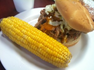 The barbecue has its own smoker in the back, and their food was great. This is the small pulled pork sandwich, which I got with corn (obviously, said Professor Snape). It comes with a honey mustard sauce instead of the red BBQ sauce. Cadillac got the brisket, which had the red sauce on it. It was all delicious but despite being small was huge.