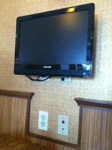 At the hotel where we stayed in Bakersfield, the restaurant had its own individual televisions in each booth, so you don’t have to talk to people. Great for families! Never talk again! Ha ha. We had breakfast there but didn’t turn it on as a matter of principle, darn it.