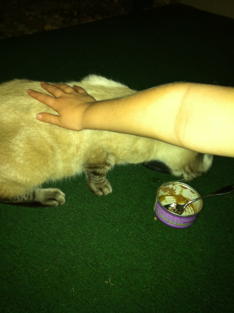 Slowly, she began letting us pet her every night. My kids took turns feeding her. She allows Little Girl, to her delight, to stroke her head. Girl Kitty purrs. Her fur is thick and soft now, her purr sounding like an engine with oil added. She will eat right in front of us. Yesterday she came to the glass door and meowed right at us, indignant at having to wait. Tonight, she returned a few hours later, coming out when Eldest went to the garage, to get more petting from everyone.