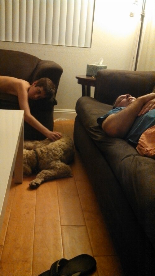 Little Girl’s been getting allergy shots for nearly a year and is at her maximum dose, which means she’s at maintenance level. She was allergic to everything that had a pulse or grew leaves, basically, but she’s so much better that her allergist wants to try her off all meds and “cautiously” calls this a cure (no jinx, knock on wood). Goldendoodles are supposed to be good for folks with allergies, if they inherit the more poodle- like hair and don’t shed as much; but our allergist says that dog allergies are individual, unlike other allergies. So you might be allergic to one specific dog and not another, regardless of breed.